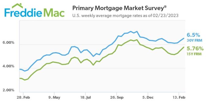 La hipoteca de tasa fija a 30 años promedió 6.50% al 23 de febrero de 2023, frente a la semana pasada cuando promedió 6.32%. Hace un año en este momento, el FRM de 30 años promedió 3.89%.