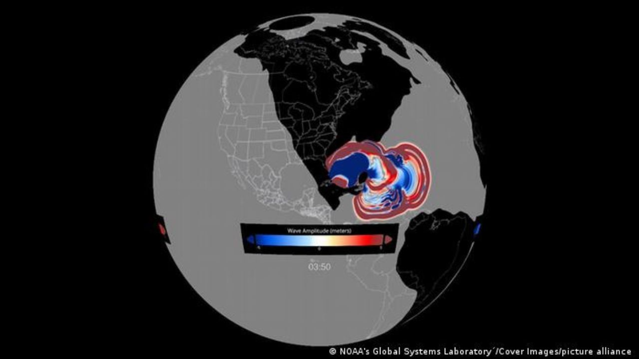 Esta simulación muestra la trayectoria de los megatsunamis creados por el asteroide que acabó con los dinosaurios. Crédito: NOAA´s Global Systems Laboratory | Cortesía