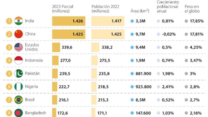 Tanto China como India tienen más de 1.400 millones de habitantes, y juntos representan más de un tercio de los 8,000 millones de habitantes del mundo.