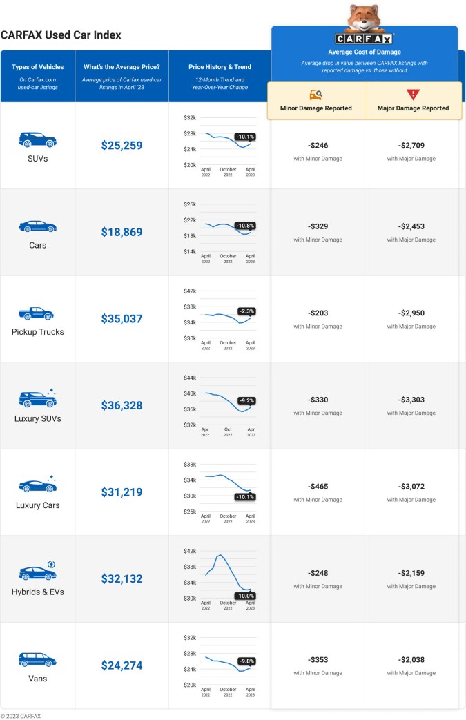 El Índice de Autos Usados de Carfax rastrea los precios de venta promedio mensuales para los autos listados en carfax.com en categorías populares, así como las tendencias de precios de 12 meses.