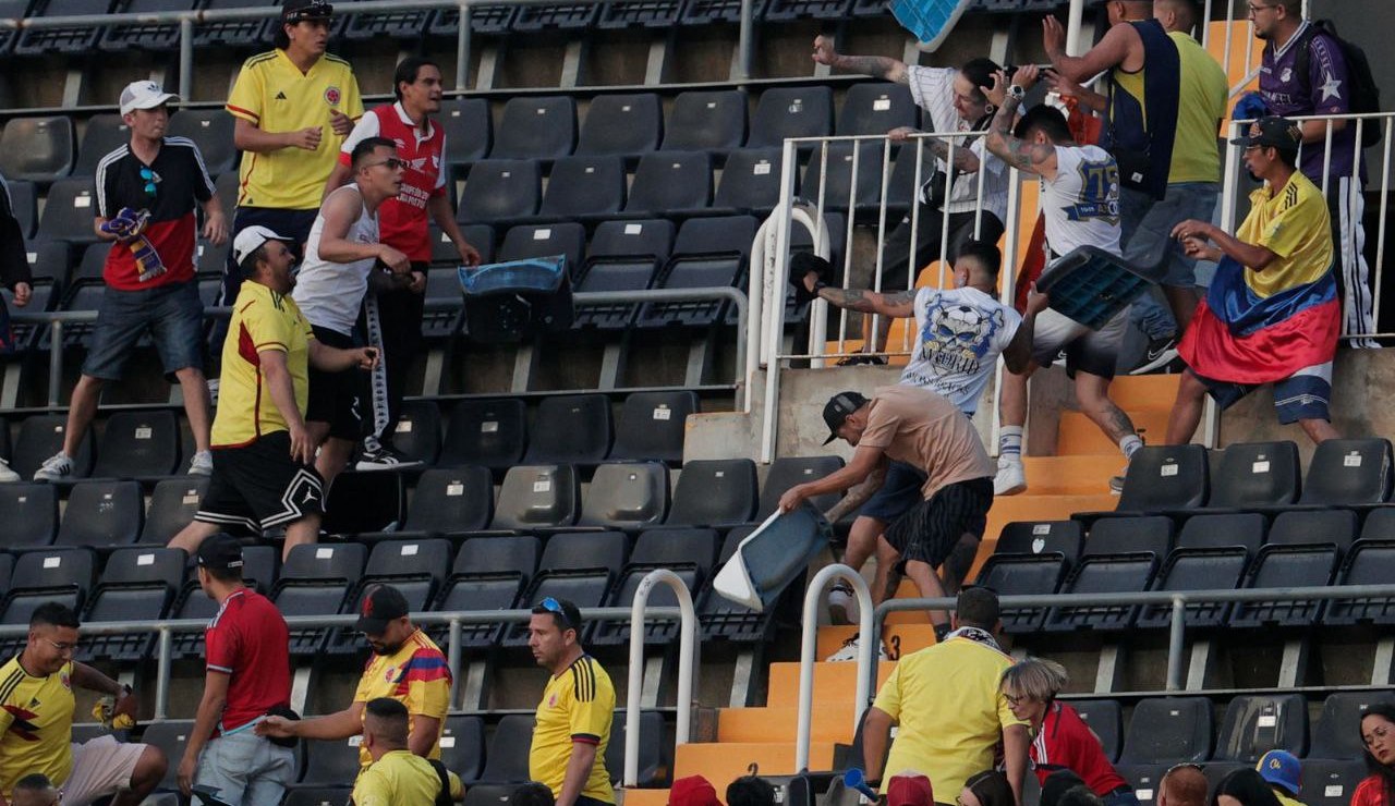 Pelea entre aficionados colombianos durante el partido de Colombia vs Irak. Manuel Bruque / EFE Crédito: Manuel Bruque | EFE