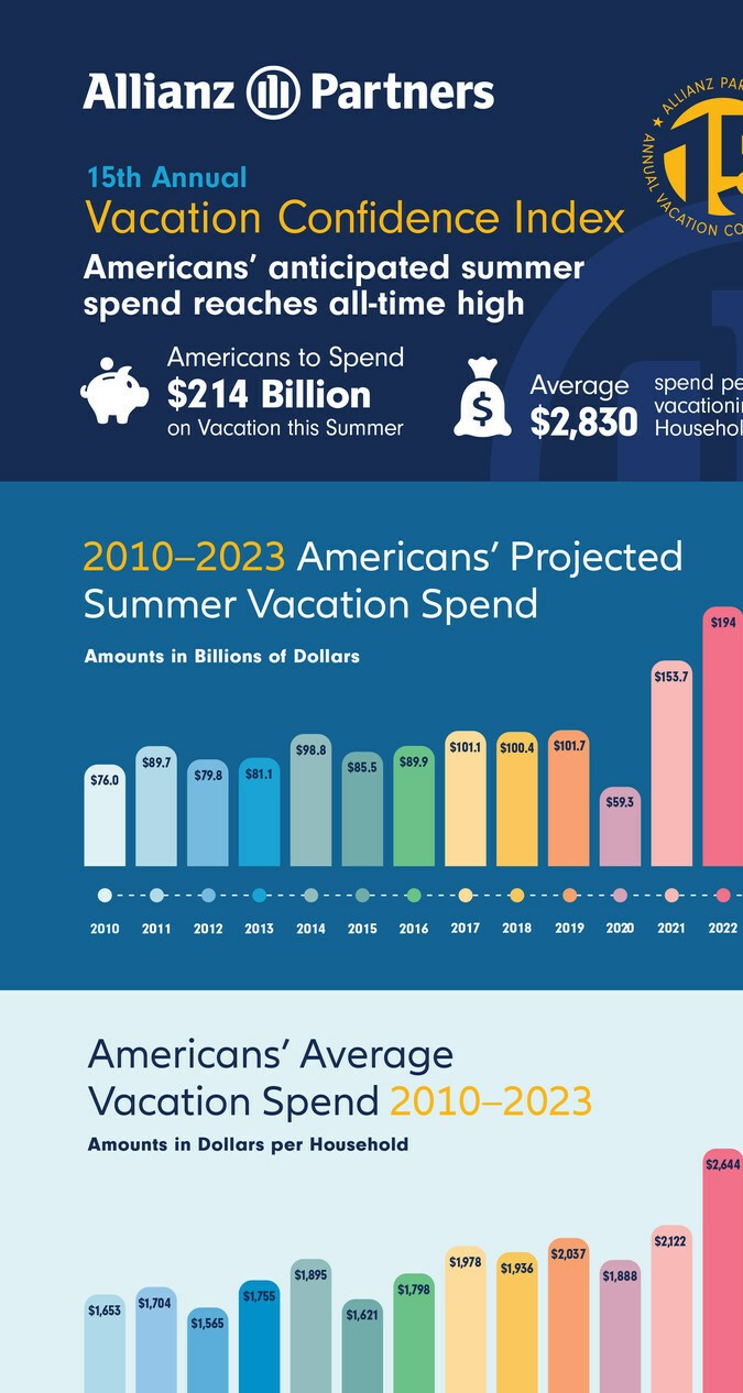 El Índice Anual de Confianza en las Vacaciones (VCI) de Allianz Partners USA, el proveedor de asistencia y seguros de viaje, reveló que es probable que el gasto de los estadounidenses en vacaciones de verano supere la marca de los $200,000 millones, pues según las proyecciones los viajeros gastarán unos $214,000 millones de dólares.