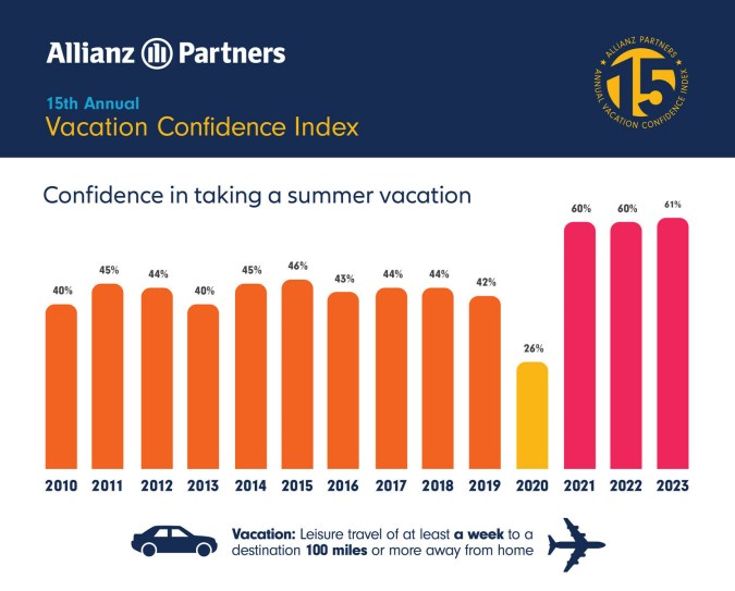 El 15° Índice Anual de Confianza Vacacional de Allianz Partners USA, revela que la confianza vacacional del consumidor continúa su tendencia de tres años con el 61% de los estadounidenses que tienen la intención de reservar un viaje de verano de 100 o más millas fuera de casa durante al menos una semana (un aumento punto desde el año pasado, 19 puntos desde 2019).