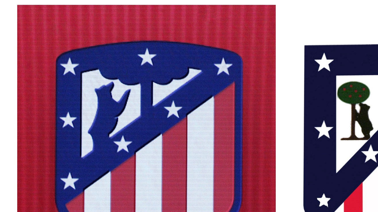 El de la izquierda es el escudo actual del Atlético de Madrid. A la derecha, el escudo anterior que volverá a partir de 2024 Crédito: Víctor Lerena | EFE