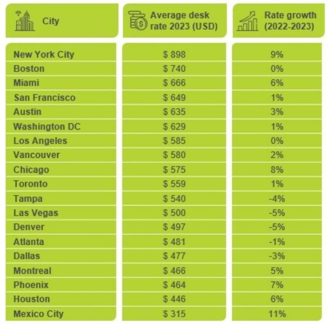 La Ciudad de Nueva York es la ciudad más costosa de Norteamérica para espacios de trabajo flexibles con una tarifa promedio de escritorios de $898 por mes. Aunque la recuperación de la oficina tradicional ha sido lenta en la ciudad, la demanda de espacio flexible permaneció por encima de los niveles anteriores a la pandemia por cuarto trimestre consecutivo en el primer trimestre de 2023, un aumento del 11% con respecto a un cuarto trimestre de 2022, un trimestre que cayó ligeramente por debajo de los niveles anteriores a la pandemia.