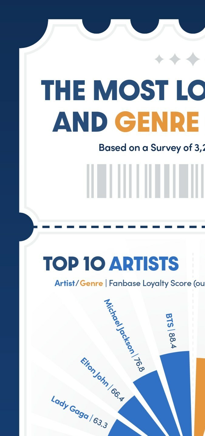 · Superando a todas las demás bases de fans con un puntaje de 88.4, los fanáticos de BTS están dispuestos a viajar un promedio de 2,040 millas solo para ver a la banda en concierto, lo más lejos que cualquier base de fanáticos.