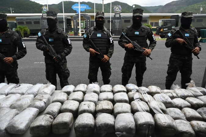 Elementos de la Policía Militar de Orden Público (PMOP) custodian droga incautada a las pandillas Barrio 18 y Mara Salvatrucha (MS-13) en cárceles hondureñas, luego de que la presidenta Xiomara Castro ordenara tomar control de la misma, en sede de la Policía Militar de Orden Público (PMOP) en Tegucigalpa. (Foto: Orlando Sierra / AFP vía Getty Images)