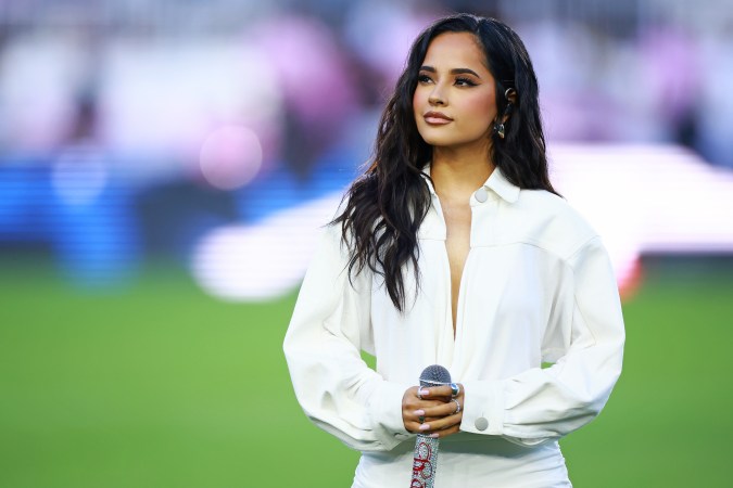 Becky G canta el himno nacional de EE.UU. previo al juego de la Leagues Cup 2023 entre Inter Miami y Cruz Azul en el DRV PNK Stadium. Foto: Hector Vivas/Getty Images.