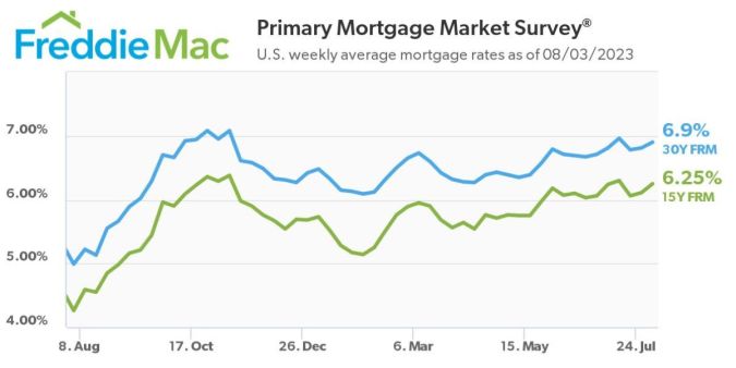 La hipoteca de tasa fija a 30 años promedió 6.90% al 3 de agosto de 2023, frente a la semana pasada cuando promedió 6.81%. Hace un año en este momento, el FRM de 30 años promedió 4.99%.