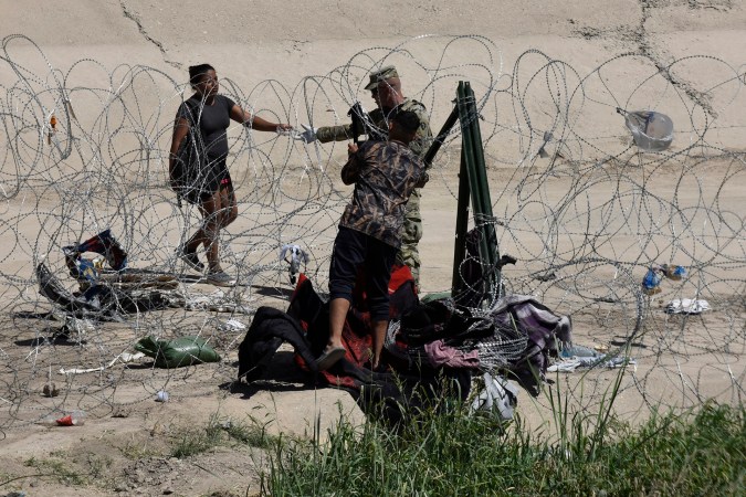 Migrantes en la frontera con México intentan desesperados librar las concertinas con alambres en el río entre Ciudad Juárez y El Paso