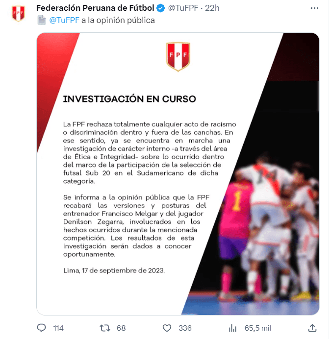 “La FPF rechaza totalmente cualquier acto de racismo o discriminación dentro y fuera de las canchas, En ese sentido, ya se encuentra en marcha una investigación de carácter interno (…) Sobre lo ocurrido dentro del marco de la participación de la selección de futsal sub-20 en el Sudamericano de dicha categoría”, informó el ente rector del fútbol peruano en un comunicado.