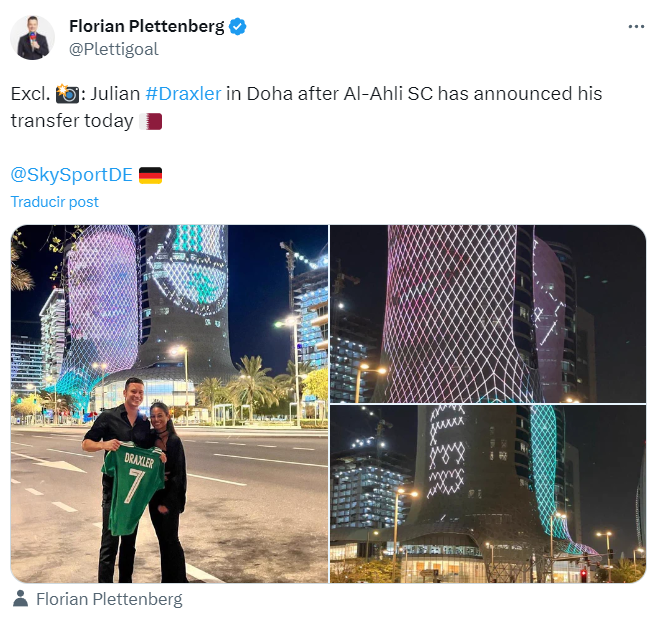 El traspaso del alemán llegó sorpresivamente después de que el mismo jugador informara que no se iría al fútbol de Qatar debido a problemas personales que parece haber solucionado ya que este sábado Draxler pasó el reconocimiento médico en Doha y firmó por su nuevo club, el Al Ahli, por dos temporadas.