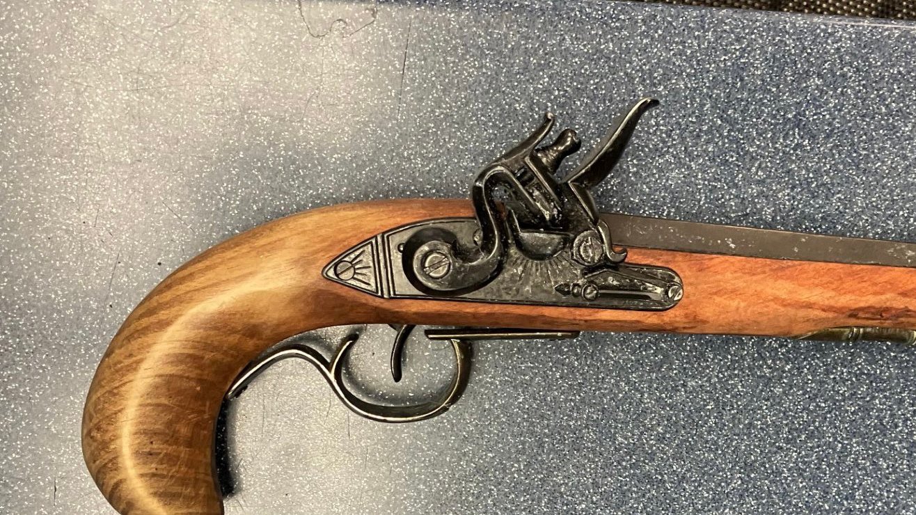 Los funcionarios procedieron a registrar al sujeto y hallaron la pistola de chispa en una funda en su bolsillo. Además, poseía entre sus cosas tres escudos policiales, todos falsos.