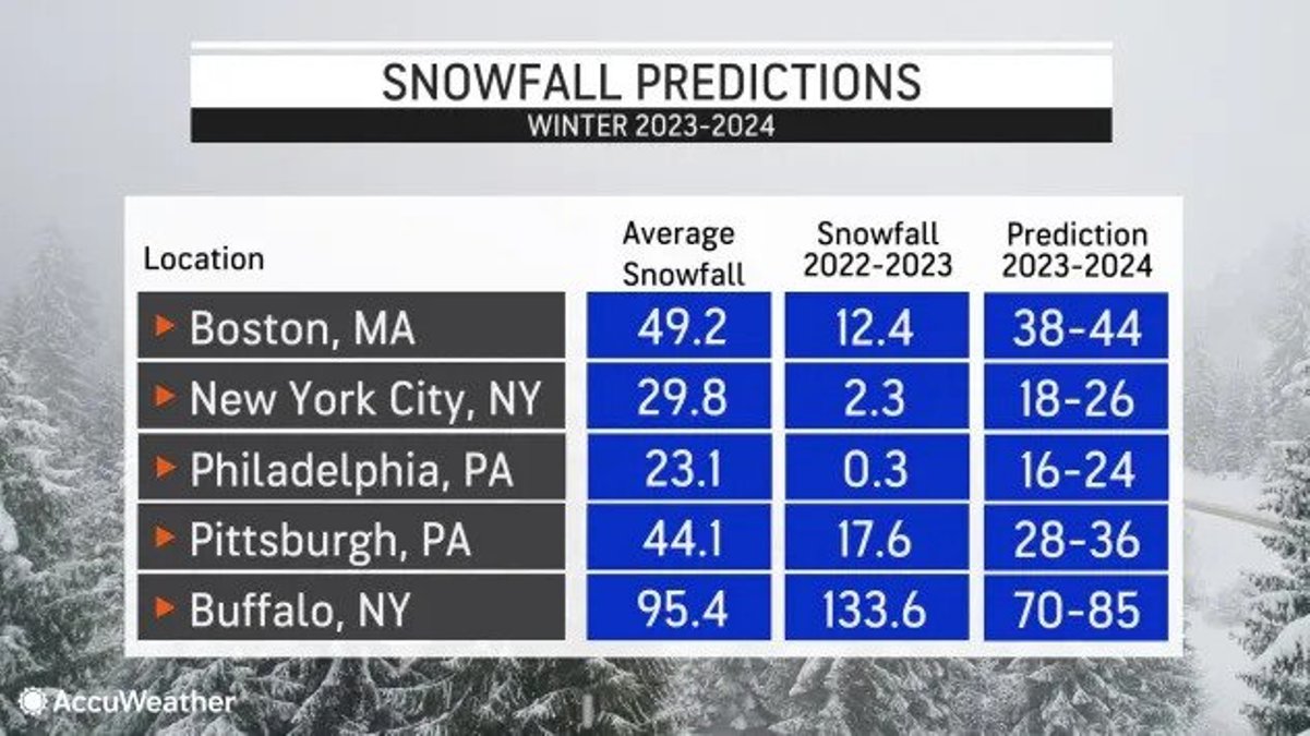 El invierno pasado Boston recibió sólo 12.4 pulgadas de nieve, la ciudad de Nueva York apenas 2.3 pulgadas y ni siquiera se necesitó una pala de nieve en Filadelfia, donde sólo se acumularon 0.3 durante todo el invierno. Este año se pronostican cantidades mucho mayores: entre 38 y 44 pulgadas en Boston, entre 18 y 26 pulgadas en la ciudad de Nueva York y entre 16 y 24 pulgadas en Filadelfia, todo alrededor del promedio histórico.