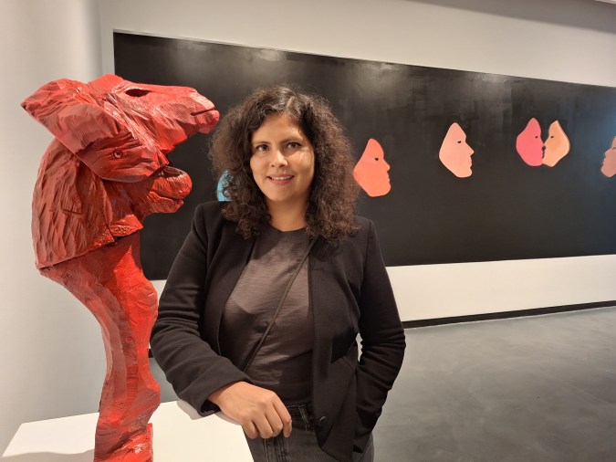 La “voz” hispana en esta colectiva es la pintora y escultora chilena Manuela Viera-Gallo, quien a través de un mural, muestra una serie de máscaras que representan la forma en que nos transformamos y estamos en constante diálogo.