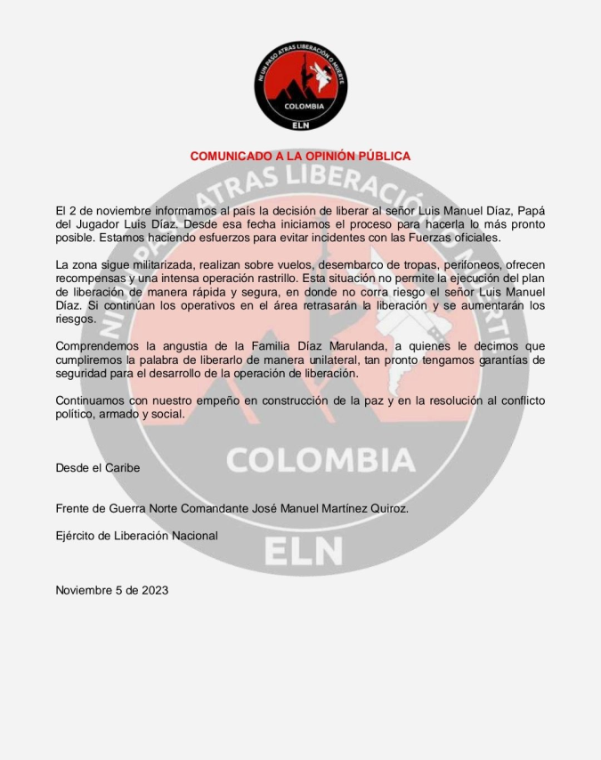 El Ejército de Liberación Nacional (ELN) de Colombia pidió “garantías” para que se concrete la liberación del padre del futbolista Luis Díaz, secuestrado el pasado 28 de octubre junto a su esposa por el grupo guerrillero.