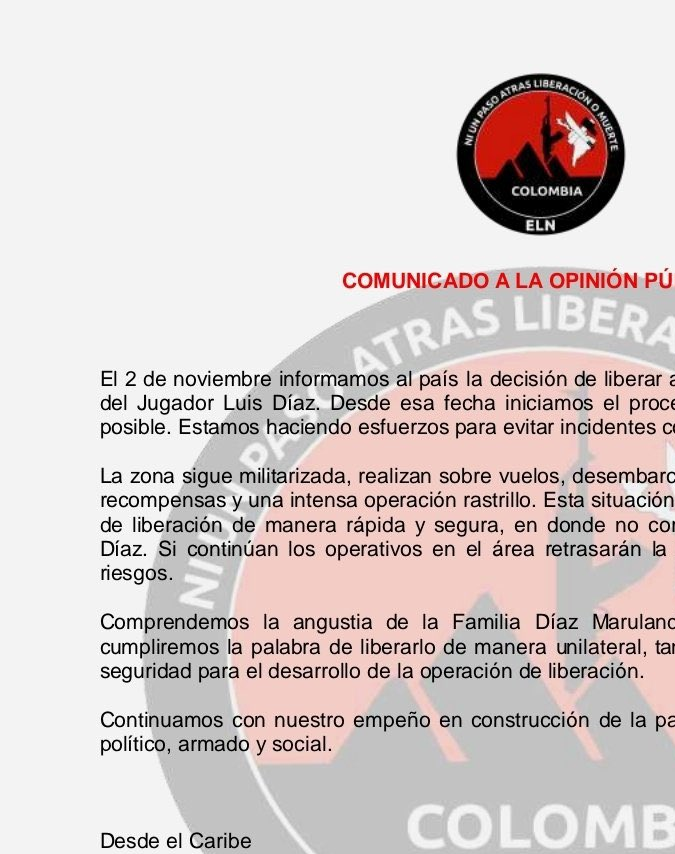 El Ejército de Liberación Nacional (ELN) de Colombia pidió “garantías” para que se concrete la liberación del padre del futbolista Luis Díaz, secuestrado el pasado 28 de octubre junto a su esposa por el grupo guerrillero.