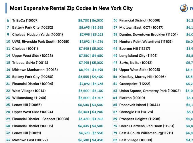 El código postal 10007 en TriBeCa destronó al código postal 10282 y se convirtió en el código postal más caro de la ciudad, con un alquiler medio de dos habitaciones que alcanza los 8.700 dólares y un alquiler medio de una habitación de 6.000 dólares al mes.