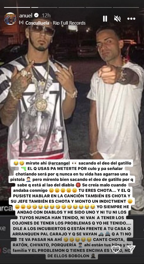 “Mírate ahí Arcángel, sacando el dedo del gatillo, el que usas pa’ meterte por c*** y pa’ señalar chotiando (delatando). Será que nunca en tu vida has agarrao’ una pistola, pero mírenlo, sacando el dedo del gatillo porque sabe que está al lado del diablo. Se creía malo cuando andaba conmigo. Tú eres chota (soplón) (…) Yo siempre he andado con diablos y he sido uno, y ni tú, ni los tuyos, nunca han tenido, ni van a tener los cojones de tener los problemas que he tenido”, escribió en una de las historias.