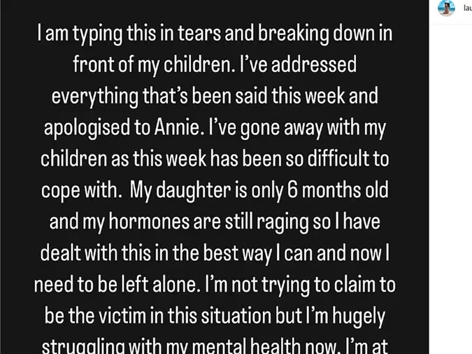 “Estoy escribiendo esto entre lágrimas y rompiéndome a llorar delante de mis hijos. Me he ido con mis hijos porque esta semana ha sido muy difícil de sobrellevar”. Luego, siguió con su relato: “Abordé todo lo que se dijo esta semana y le pedí disculpas a Annie”.