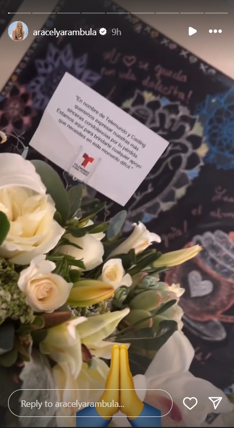 “En nombre de Telemundo y Casting queremos expresar nuestras más sinceras condolencias por tu pérdida. Estamos aquí para brindarle cualquier apoyo que necesites en este momento difícil“, dice la tarjeta que le enviaron a la actriz y que además acompañaron unas rosas blancas.