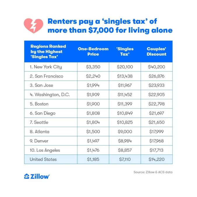 Los últimos hallazgos de Zillow revelan un elevado “impuesto a los solteros” que podría desanimar a las personas que viven solas. Los inquilinos que desafían el mercado de una habitación por su cuenta ahora están pagando una prima de $7,110 por año para vivir solos, un aumento de más de $100 con respecto a la ya asombrosa cifra del año pasado.