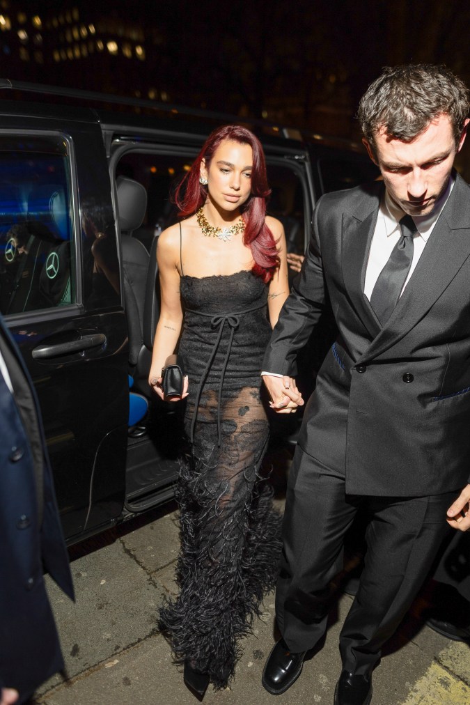 La pareja fue fotografiada por los paparazzi saliendo del evento tomados de la mano. En las postales, Dua Lipa viste un ajustado vestido color negro con transparencias y detalles de encaje del diseñador Valentino.
