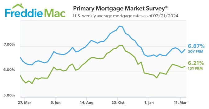 El FRM a 30 años promedió en 6.87 por ciento al 21 de marzo de 2024, frente a la semana pasada cuando promedió en 6.74 por ciento. Hace un año en este momento, el FRM a 30 años promediaba en 6.42 por ciento.