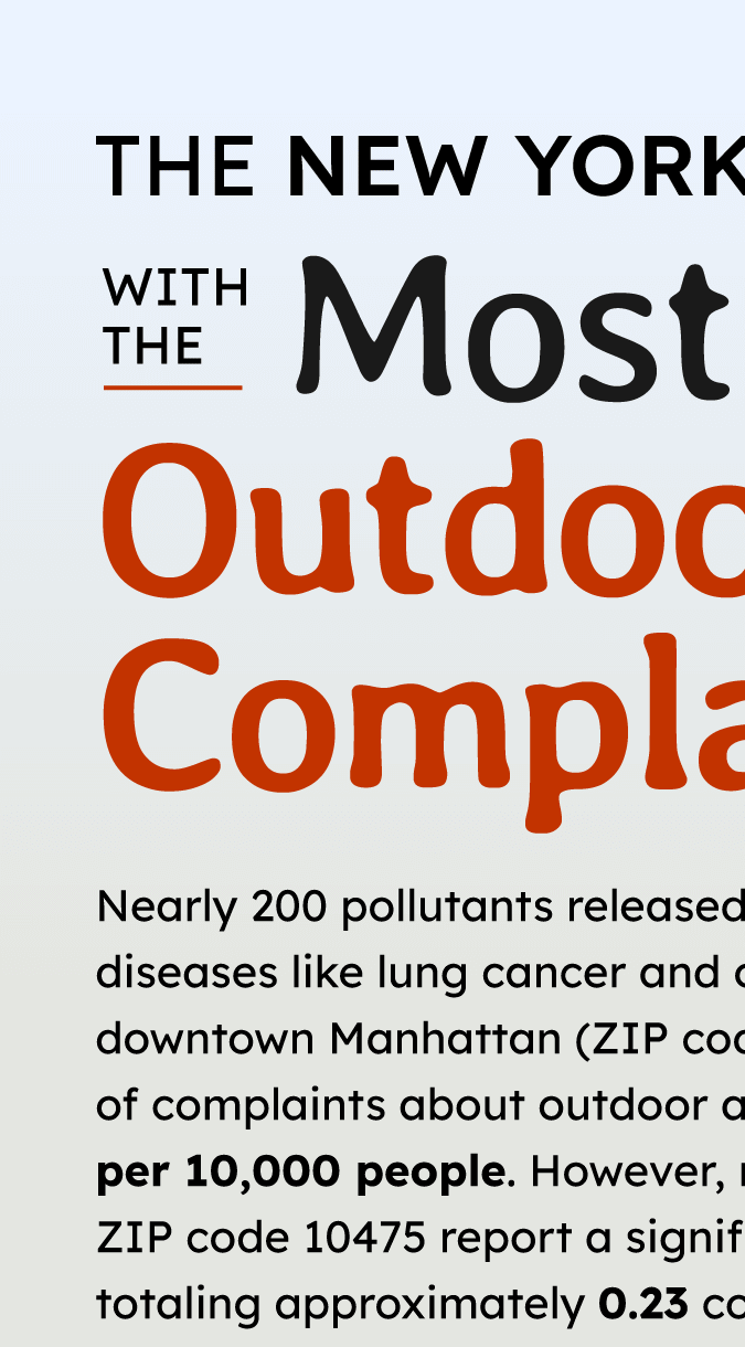 Mientras tanto, en el área de New Hyde Park, código postal 11040, las quejas sobre la calidad del aire el año pasado fueron mínimas, con solo 0,23 por cada 10,000 personas. Un estudio previo de HouseFresh reveló que New Hyde Park también tiene la menor cantidad de quejas 311 relacionadas con el saneamiento, lo que sugiere que el área está muy limpia o que los residentes son reacios a presentar quejas.