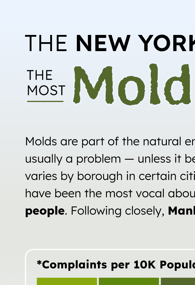 El Bronx alberga una densa población en viviendas públicas, donde el manejo del moho puede ser complicado. Aproximadamente el 8% de los niños en el Bronx sufren enfermedades pulmonares crónicas y las tasas de asma en el sur del Bronx son 8 veces más altas que el promedio nacional. Los informes de moho en el Bronx han aumentado un 17,12% en los últimos 5 años.