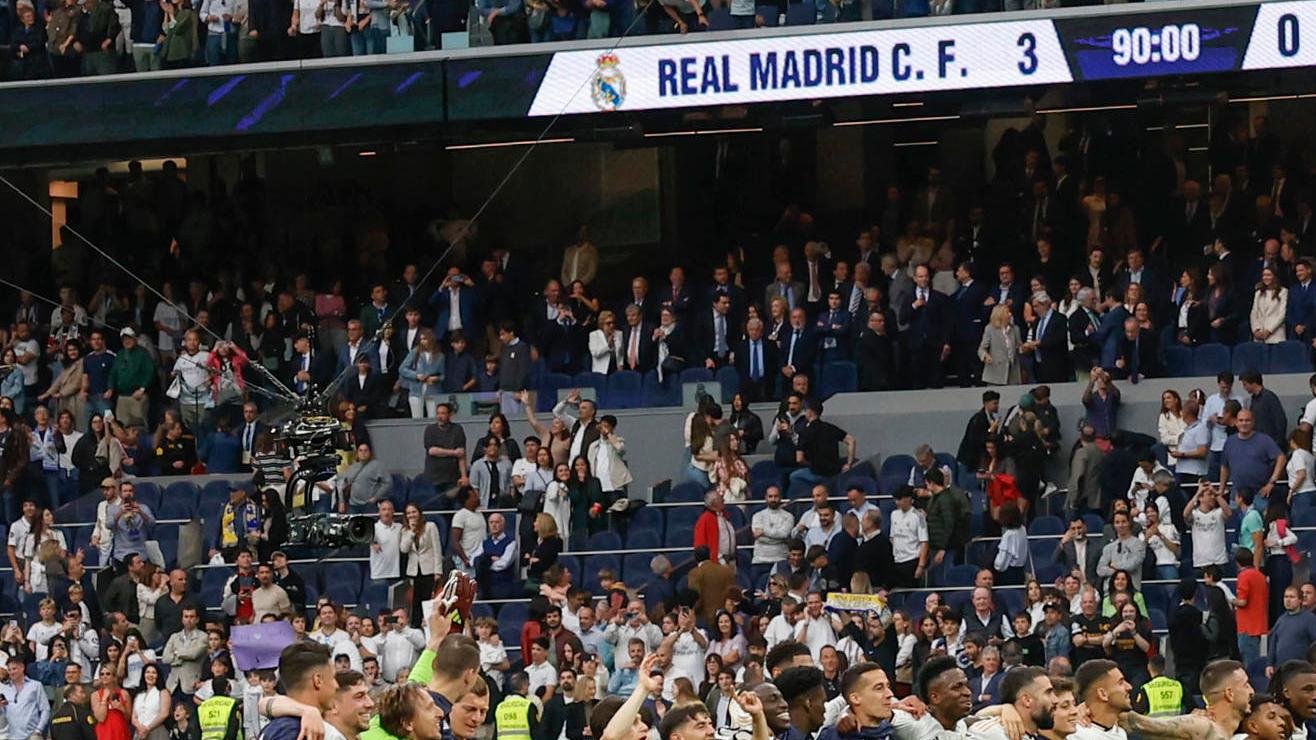 El título liguero se confirmó matemáticamente tras la victoria del Real Madrid ante el Cádiz y la posterior derrota del Barcelona en Montilivi frente al Girona. Los jugadores y el cuerpo técnico, encabezados por Carlo Ancelotti, celebraron de forma comedida en el palco de honor del Bernabéu y emplazaron a la afición, que ya se había congregado en la fuente de Cibeles, a una fecha próxima para el festejo oficial.
