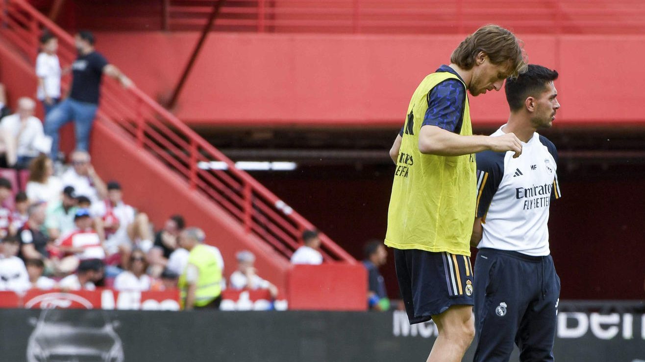 El centrocampista croata del Real Madrid Luka Modric, durante el calentamiento previo al partido de la jornada 35 de LaLiga EA Sports entre el Granada y el Real Madrid. Crédito: Miguel Angel Molina | EFE