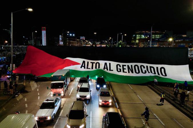 Los activistas también colgaron otra bandera blanca en un puente peatonal con el mensaje “Nunca más estados sionistas genocidas en Colombia y Palestina”.