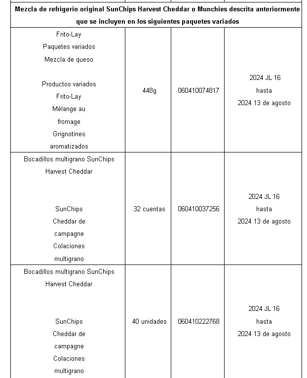 Todos los tamaños de la mezcla de bocadillos originales SunChips Harvest Cheddar Whole Grain Snacks y Munchies con fechas de frescura garantizada entre el 16 de julio y el 13 de agosto de 2024 se ven afectados.
