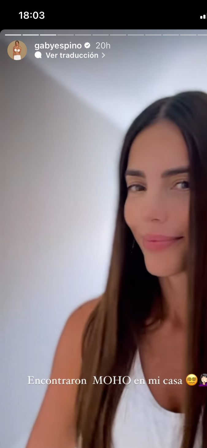 En el primer video se ve a Espino usando tapabocas y caminando por la segunda planta de su casa. En la siguiente historia anuncia: “encontraron moho en mi casa”.