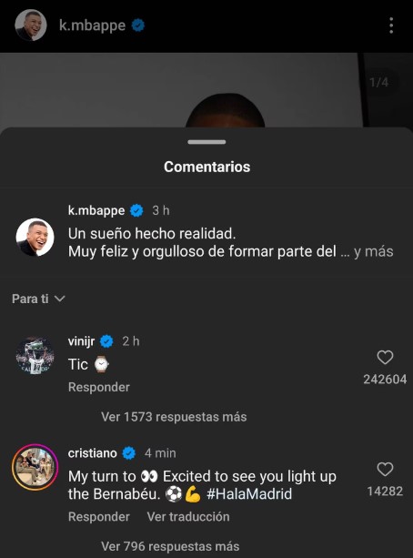 A lo que Cristiano Ronaldo respondió: “Mi turno. Emocionado de verte brillar en el Bernabéu. ¡Hala Madrid!”. Fue el comentario de CR7 en el posteo de Instagram de Mbappé, que luego le correspondió con tres emojis de una corona, un gesto de agradecimiento y la cabra que simboliza la sigla G.O.A.T (más grande de todos los tiempos).