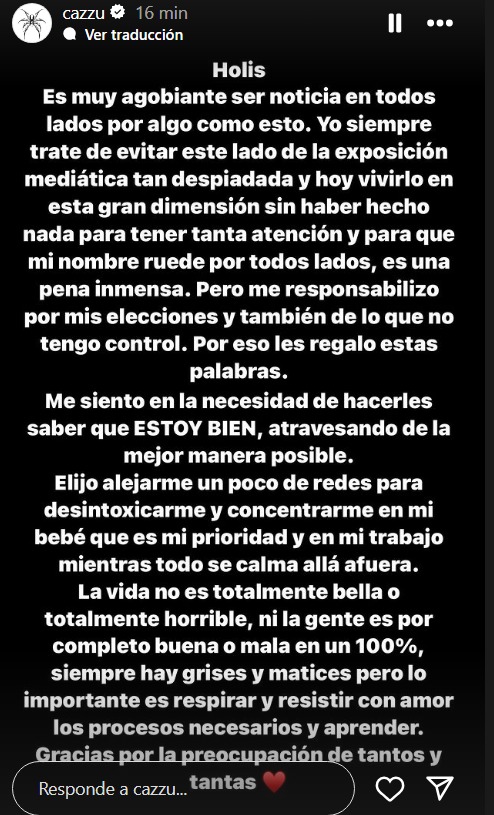 “Me siento en la necesidad de hacerles saber que estoy bien”, aclara Cazzu. Pero admite que también está tratando de atravesar todo este momento de la “mejor manera posible”. Ante la situación ella ha tomado una decisión, y asegura que por esto mismo elije alejarse “de las redes para desintoxicarme y concentrarme en mi bebé que es mi prioridad y en mi trabajo, mientras todo se calma allá afuera”.