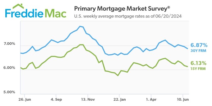 El FRM a 30 años promedió el 6.87 por ciento al 20 de junio de 2024, frente a la semana pasada cuando promedió el 6.95 por ciento. Hace un año en este momento, el FRM a 30 años promediaba el 6.67 por ciento.