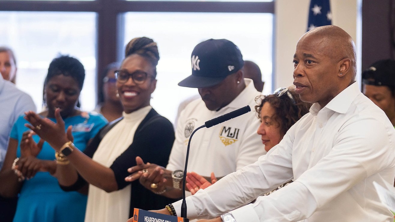 El alcalde de Nueva York, Eric Adams, celebró la nueva inversión para mejorar los parques de la ciudad desde el Brownsville Recreation Center, Brooklyn. Crédito: Ed Reed | NYC Mayoral Office