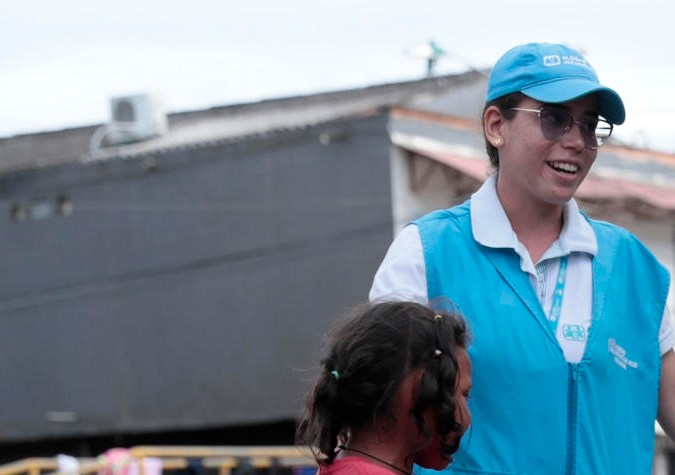 Uno de esos niños, a punto de embarcar, se encuentra con Ángela, una de las trabajadoras de Aldeas Infantiles que acompaña a las familias, mientras le coloca un sello de una cara sonriente en la mano y le dice: “Esto es para que te proteja”.