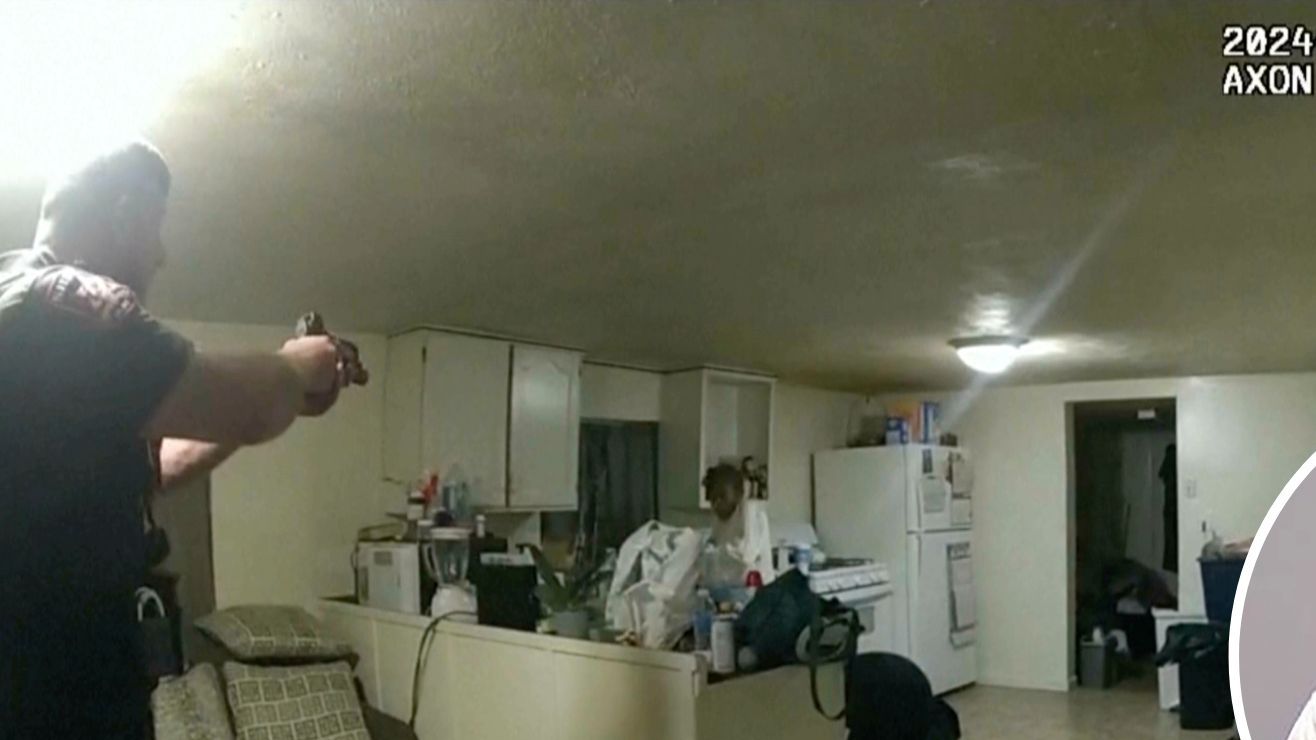 Massey estaba en la cocina, y un mueble dividía la sala del lado donde estaba Grayson. En las imágenes de la cámara corporal de Grayson apuntó con su arma a Massey. Ella se agachó y levantó las manos.