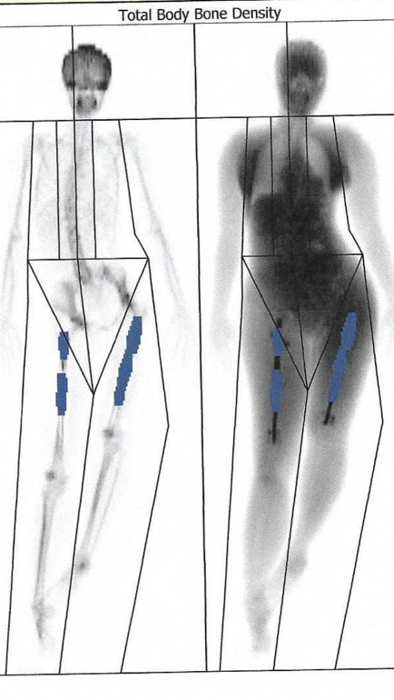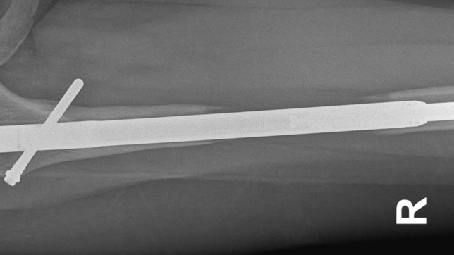 Seis semanas después, tomografías de la pierna derecha mostraron una alarmante ausencia de crecimiento óseo. Su fémur era básicamente dos pedazos de hueso unidos por una varilla de metal.