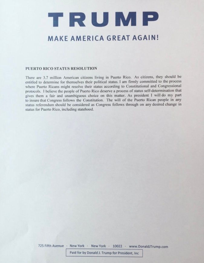 “Yo estoy firmemente comprometido con un proceso mediante el que los puertorriqueños puedan resolver su estatus acorde con los protocolos constitucionales y congresionales. Yo creo que Puerto Rico merece un proceso de autodeterminación que les brinde una alternativa justa y no ambigua en este asunto. Como presidente, yo haré mi parte para asegurar que el Congreso siga la Constitución. La voluntad de la gente de Puerto Rico en cualquier referéndum de estatus debe ser considerado mientras el Congreso sigue adelante con cualquier cambio deseado de estatus para Puerto Rico, incluyendo la estadidad”, lee el mensaje pagado por “Donald Trump for President”.