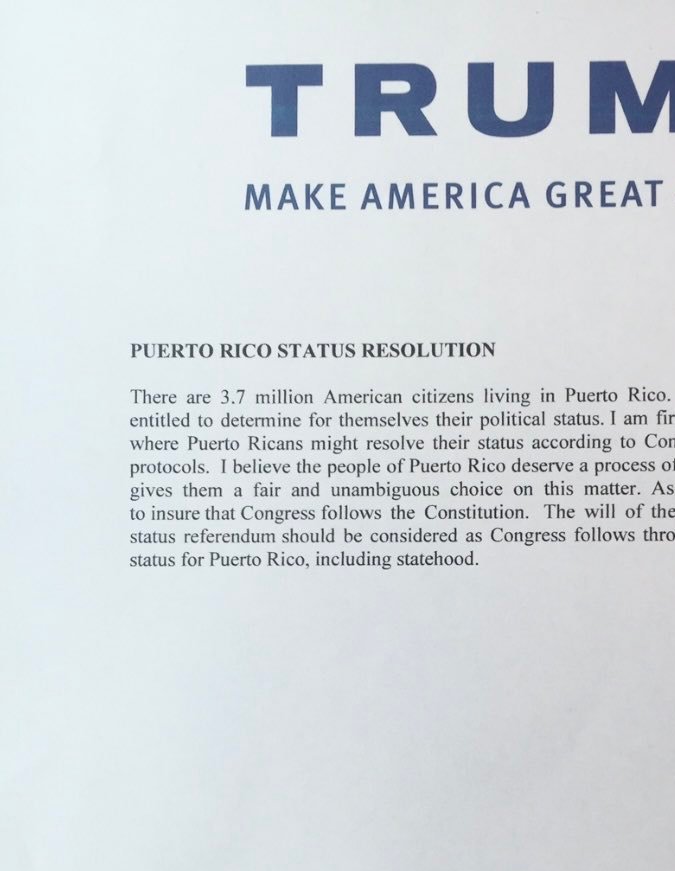 “Yo estoy firmemente comprometido con un proceso mediante el que los puertorriqueños puedan resolver su estatus acorde con los protocolos constitucionales y congresionales. Yo creo que Puerto Rico merece un proceso de autodeterminación que les brinde una alternativa justa y no ambigua en este asunto. Como presidente, yo haré mi parte para asegurar que el Congreso siga la Constitución. La voluntad de la gente de Puerto Rico en cualquier referéndum de estatus debe ser considerado mientras el Congreso sigue adelante con cualquier cambio deseado de estatus para Puerto Rico, incluyendo la estadidad”, lee el mensaje pagado por “Donald Trump for President”.