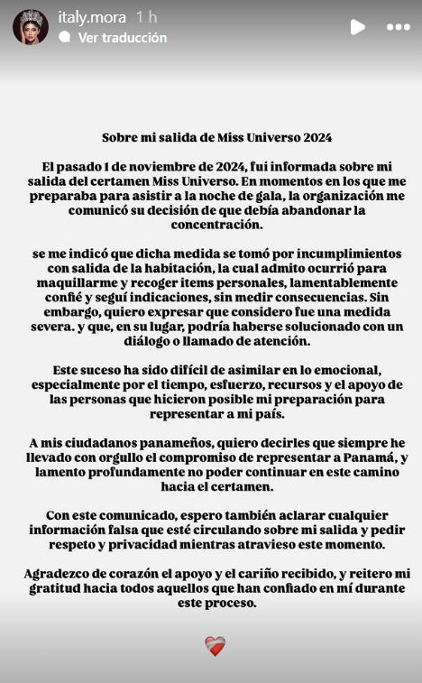 Sin embargo, la explicación que pretende dar el certamen es poco clara y en ningún momento se revela una razón concreta que justifique la decisión, hasta hoy, porque hace unas horas, la cuenta de Instagram con la que el certamen etiqueta a Italy Mora en alguna de sus publicaciones, la cual parece ser su cuenta personal, lanzó un comunicado en el que Miss Panamá explica las razones por las cuales la castigaron con tanta severidad.
