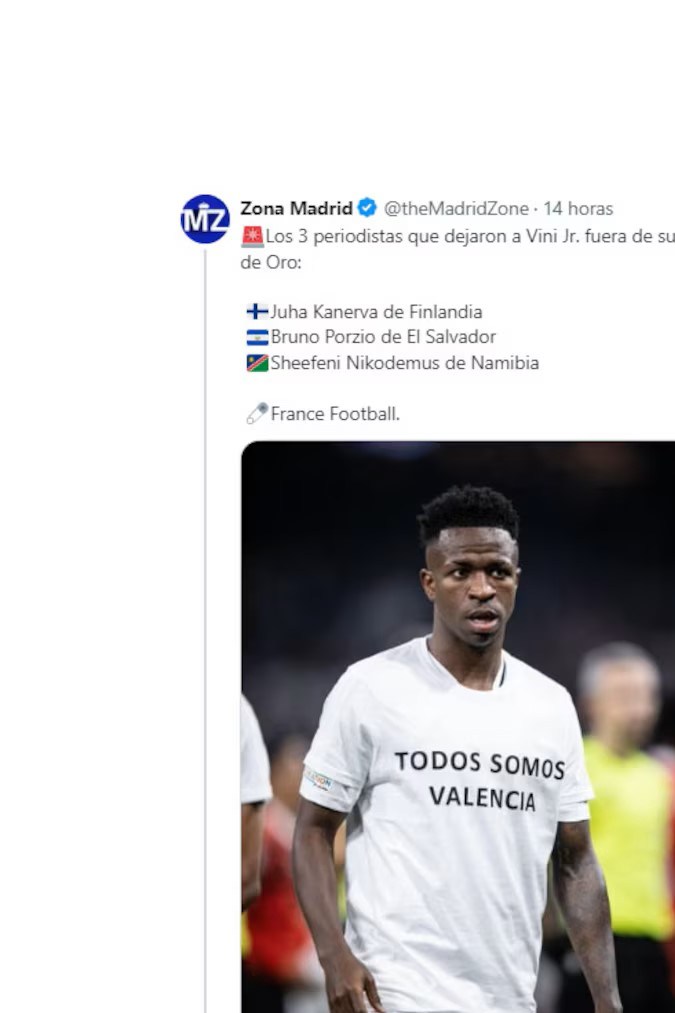 “Fue un error técnico mío. Voy a renunciar al jurado del Balón de Oro”, respondió Kanerva a un posteo de la cuenta Madrid Zone, en la red social X (ex Twitter), que mencionaba la nacionalidad, nombre y apellido de los tres jurados que habían dejado fuera de la contienda a Vinícius Jr. Además, respondió a otras menciones que se hicieron sobre él en las redes: “Este fue un fallo técnico mío, del que asumo la responsabilidad. Dejo mi puesto como seleccionador del Balón de Oro”.