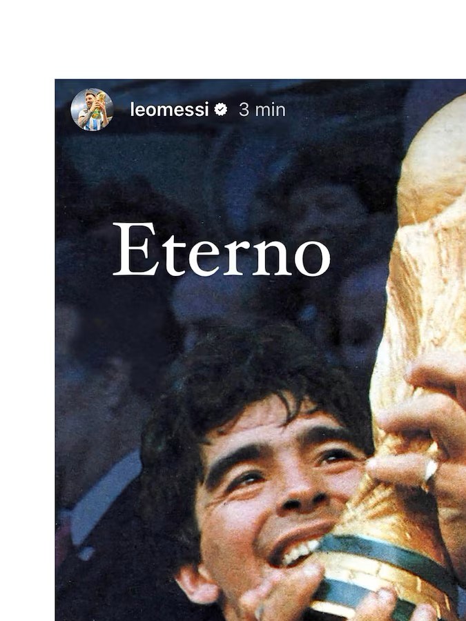 En un nuevo aniversario de la noticia que sacudió al deporte, celebridades, compañeros, amigos y familiares expresaron su dolor por la ausencia de Maradona. Y, como no podía ser de otra manera, Messi también le dejó un tributo al barrilete cósmico. Publicó la imagen del Pelusa acariciando la Copa del Mundo obtenida en 1986 y con una enorme sonrisa grabada en su rostro. Le adosó un mensaje: “Eterno”.