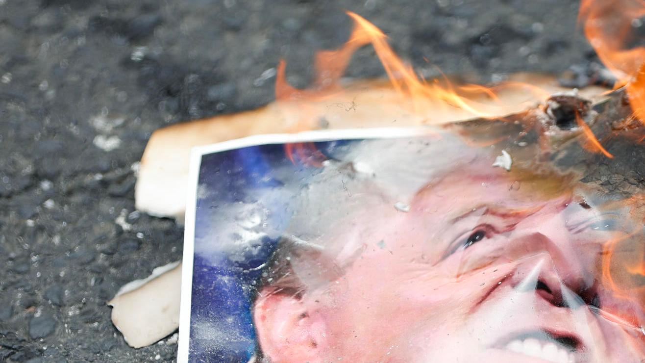 Fotografía de un cartel quemado con la imagen de Donald Trump durante una manifestación este lunes, en Ciudad de Panamá (Panamá). Crédito: Bienvenido Velasco | EFE
