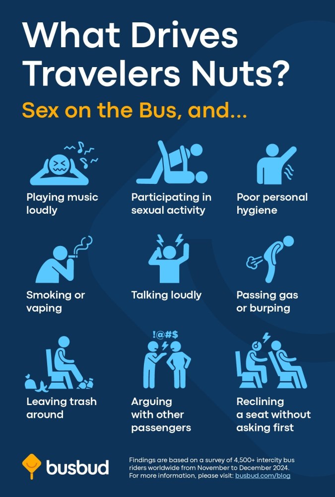 En vísperas de la temporada de viajes más concurrida del año, Busbud, una plataforma global de reserva de viajes terrestres, publicó su encuesta global sobre etiqueta en los autobuses, que señala que participar en actividades sexuales en el autobús es una de las principales cosas que más molestan a los demás pasajeros. Sin embargo, lo que más vuelve locos a los pasajeros de un autobús varía según el país: los norteamericanos (estadounidenses y canadienses), los británicos y los sudafricanos afirman que la mala higiene personal es la mayor ofensa.