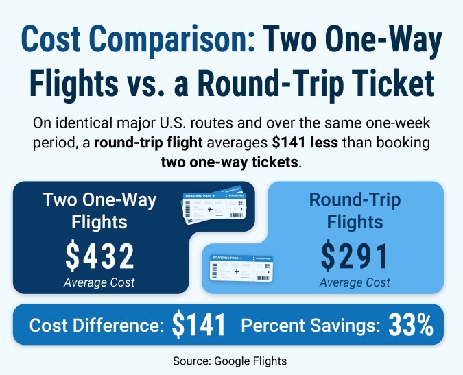 Un vuelo de ida y vuelta cuesta un 33% menos que reservar dos billetes de ida, lo que supone un ahorro medio de $141 dólares para los viajeros.